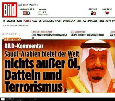 «بیلد» پرتیراژترین روزنامه آلمان در تیتر صفحه اول خود نوشت: «عربستان سعودی جز نفت، خرما و تروریسم چیز دیگری برای عرضه به جهان ندارد و برای ادامه اقدام های خود به ما هم رشوه می دهد.»