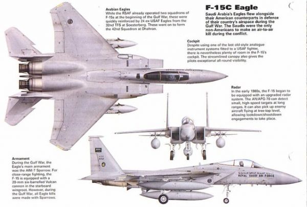 سعودی از این جنگنده 86 فروند از نوع F-15C/D در اختیار دارد که ویژه درگیریهای «هوا-هوا» است. این را میتوان به جنگندههای چند منظوره F-15S افزود که به «عقاب کوبنده» معروف است. این جنگنده به آن اندازه پیشرفته است که میتواند عمق ایران را هدف قرار دهد بدون اینکه جنگندههای ایران برایش مانعی ایجاد کنند.