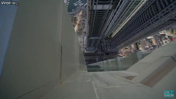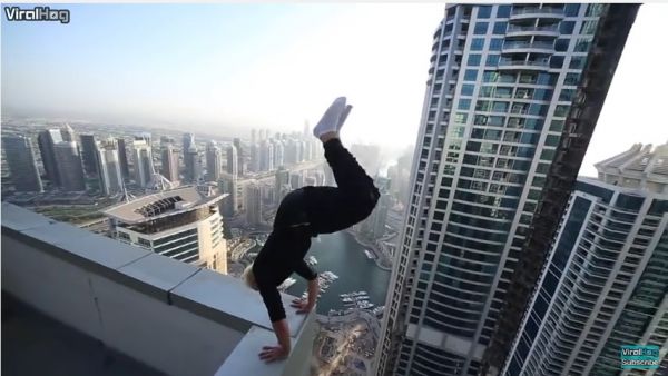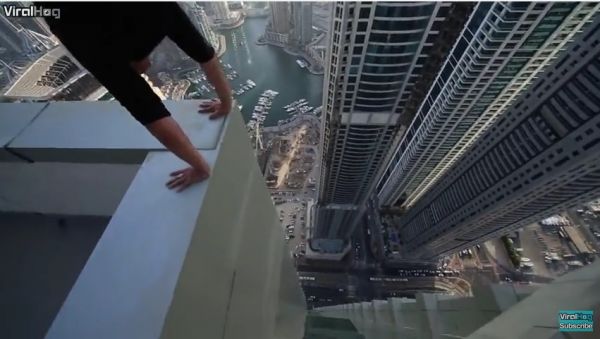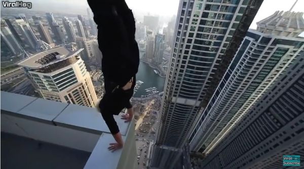 حفظ تعادلی نفس گیر بر روی دست در لبه یک آسمانخراش در دبی