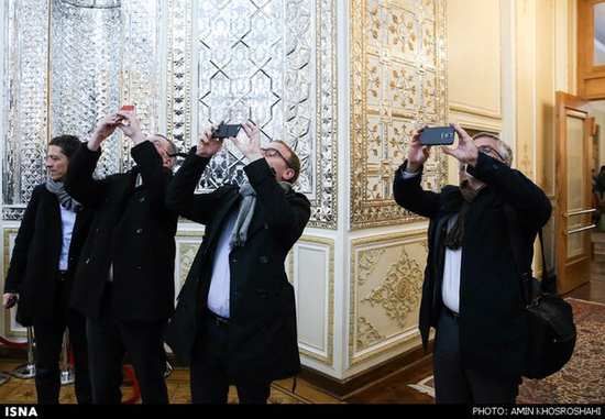 دیپلمات های آلمانی در تالار آئینه وزارت خارجه که محل برگزاری نشست های خبری می باشد حضور یافتند و از آئینه کاری و گچ بری های آن شگفت زده شدند و عکاسی کردند.