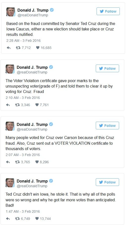 دونالد ترامپ روز چهارشنبه در توییتر از آنچه که آن را "تقلب" کروز نامیده اعلام انزجار کرده و در توییت های متعدد بیان کرده که چرا معتقد است "یا باید یک رای گیری دیگر انجام شود و یا نتایج کروز باطل شود."