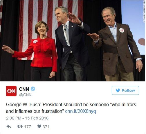 جرج بوش و همسرش لورا بوش در گردهمایی انتخاباتی جب بوشگزارش ها حاکی است که جورج بوش، رییس جمهور سابق آمریکا، روز دوشنبه ۱۵ فوریه برای نخستین بار با حضور در یک گردهمایی انتخاباتی برادرش جب بوش در کارولینای جنوبی، بدون نام بردن از دونالد ترامپ، نامزد پیشتاز جمهوریخواهان از وی انتقاد کرده است.جرج بوش در نخستین حضورش در یک گردهمایی برای کمک به مبارزات انتخاباتی برادرش در شهر چارلزتان، کارولینای جنوبی گفته است: «میدانم که آمریکاییها عصبانی و سرخورده شدهاند، اما ما به کسی در کاخ سفید نیاز نداریم که آینه خشم و سرخوردگی ما باشد.»