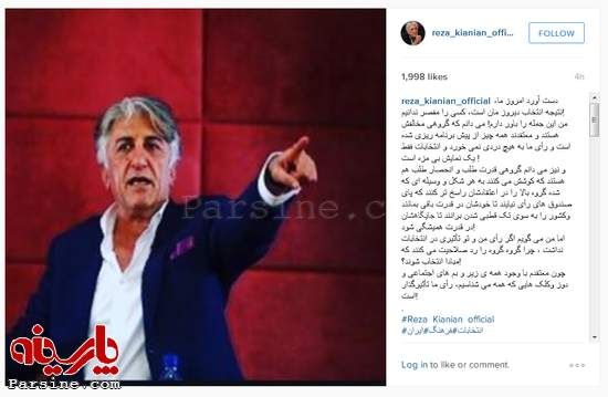 به گزارش پارسینه، رضا کیانیان بازیگر سینما و تئاتر در صفحه شخصی اینستاگرام خود نوشت:دست آورد امروز ما، نتیجه انتخاب دیروز مان است، کسى را مقصر ندانیم!