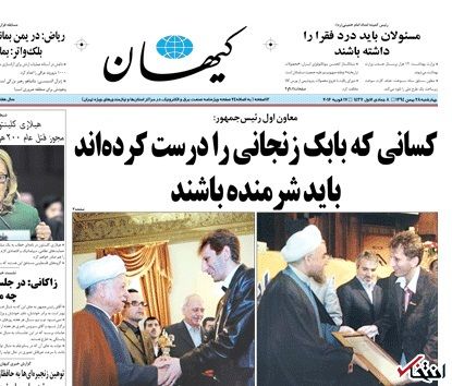 سهراب زند؛ سرویس سیاسی «انتخاب»: روزنامه کیهان در واکنش به سخنان آقای اسحاق جهانگیری معاون اول رئیس‌جمهور، که گفته بود: "کسانی که بابک زنجانی را درست کرده‌اند باید شرمنده باشند"، دو عکس بزرگ در صفحه اول خود از آیت‌الله هاشمی رفسنجانی و دکتر حسن روحانی در حال تقدیر از بابک زنجانی منتشر نمود تا بگوید این دو نفر بابک زنجانی را درست کرده‌اند.(28 بهمن 1394)