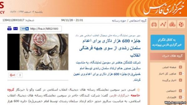 خبرگزاری فارس در ایران در گزارشی از جمع آوری جایزه ۶۰۰ هزار دلار برای اعدام سلمان رشدی از سوی "جبهه فرهنگی انقلاب" خبر داده است.این خبرگزاری نزدیک به سپاه پاسداران، گزارش داده شرکت کنندگان در سومین نمایشگاه "رسانه های دیجیتال انقلاب اسلامی" به مناسبت سالروز صدور حکم "ارتداد" سلمان رشدی توسط آیت الله خمینی هر کدام مبالغی اهدا کردند تا به کسی که سلمان رشدی را ترور کند، پرداخت شود.