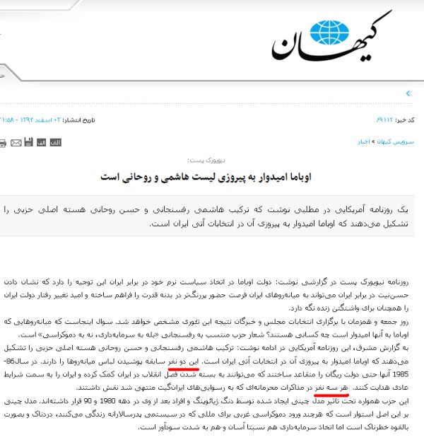 امروز روزنامه کیهان در یکی از تیترهای صفحه اول خود نوشته است: "نیویورک پست: اوباما امیدوار به پیروزی لیست هاشمی و روحانی است."