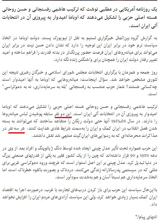 اما سوم که از همه مهمتر است: اصلی ترین بخشی از این خبر که کاملا هدفمند و سوگیرانه در ترجمه حذف شده است، نام یکی از آن میانه روهایی است که به قول نیویورک پست مورد حمایت اوباما هستند یعنی "قربانعلی دری نجف آبادی"! در واقع این مطلب نام و تصویر سه نفر را به عنوان افراد مورد حمایت و امید اوباما ذکر کرده است: هاشمی و روحانی و دری نجف آبادی.