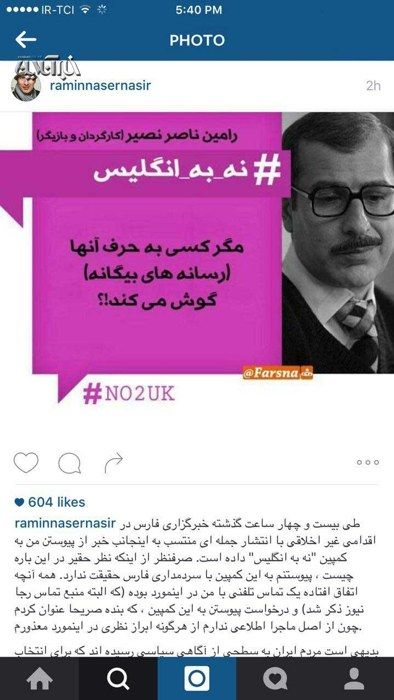 به گزارش خبرآنلاین، رامین ناصرنصیر در صفحه اینستاگرامش در کنار تصویری با برچسب خبرگزاری فارس، متنی را به اشتراک گذاشت:طی بیست و چهار ساعت گذشته خبرگزاری فارس در اقدامی غیر اخلاقی با انتشار جملهای منتسب به اینجانب خبر از پیوستن من به کمپین «نه به انگلیس» داده است. صرفنظر از اینکه نظر حقیر در این باره چیست، پیوستنم به این کمپین با سردمداری فارس حقیقت ندارد. همه آنچه اتفاق افتاده یک تماس تلفنی با من در این مورد بوده (که البته منبع تماس رجانیوز ذکر شد) و درخواست پیوستن به این کمپین، که بنده صریحا عنوان کردم چون از اصل ماجرا اطلاعی ندارم از هرگونه ابراز نظری در این مورد معذورم. بدیهی است مردم ایران به سطحی از آگاهی سیاسی رسیدهاند که برای انتخاب نه احتیاجی به نظر رسانههای خارجی دارند، و نه نظر امثال بنده، و صد البته نه قیممابی و مهندسی خبرگزاری فارس.