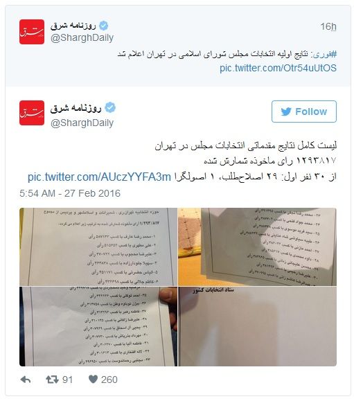 یکی از تجمع های انتخاباتی اصلاح طلبان در تهران ستاد انتخابات در اطلاعیه ۵۵ خود اعلام کرده است، از مجموع یک میلیون و ۲۹۳ هزار رأی شمارش شده در حوزه انتخابیه تهران، محمدرضا عارف با ۵۸۷ هزار رأی اول و علی مطهری با ۵۱۵ هزار رأی دوم است.براساس آمار ارائه شده کلیه نامزدهای مورد حمایت اصلاح طلبان در فهرست امید،در لیست ارائه شده از نتایج ۳۱ نفر اول حضور دارند و تنها غلامعلی حداد عادل با ۴۳۵ هزار رأی هفتم است.