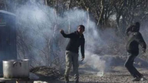 پلیس سعی داشت مهاجران را که سنگ پرتاب میکردند را با گاز آشک آور متفرق کند.