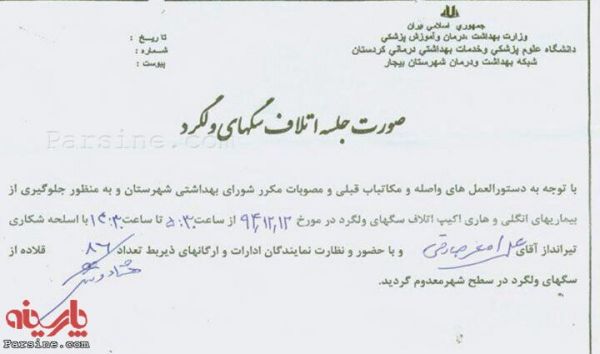 صورت جلسه اتلاف سگ های ولگرد توسظ شبکه بهداشت شهرستان بیجار/کردستان