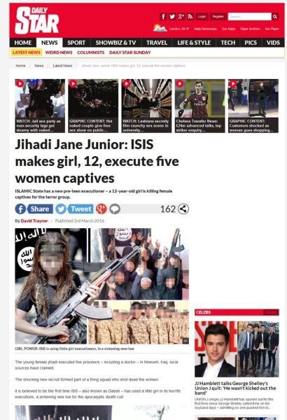 جام نیوز: روزنامه انگلیسی The Daily Star با استناد به منبع خود، از یک جنایت سازمان یافته دیگر توسط داعش خبر داد. این روزنامه نوشت: جین دختر 12 ساله ای است که عضو گروه تروریستی «داعش» است 5 زن را اعدام کرد. در بین کشته شدگان یک پزشک وجود دارد. جرم این پزشک خودداری از معالجه تروریستها بود! این قتل ها در « نینوا» عراق رخ داد. این روزنام در ادامه افزود: «به نظر می آید داعش برای اولین بار است که از یک دختر برای چنین روشی استفاده می کند و این شیوه خود نوعی کودک آزاری جدید است.»