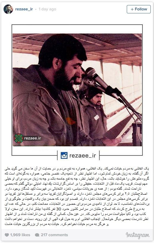 محسن رضایی با انتشار مطلبی در شبکه اجتماعی «اینستاگرام»، با انتقاد از اصلاحطلبان نوشته آنها در جریان انتخابات «دروغ» گفتند که ۳۰ نامزد دارند و با این کار به مردم «خیانت» کردند.به گزارش روز یکشنبه ۲۳ اسفندماه خبرگزاریهای «نسیمآنلاین» و «تسنیم»٬ آقای رضایی گفته این سخنان اصلاحطلبان «اولاً کذب بود و ثانیاً میتوانست مردم را مأیوس کند».