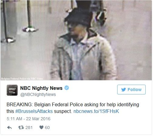 پلیس بلژیک تصویری از یک مرد که لباس سفید پوشیده و کلاه بر سر دارد، منتشر کرده و از او به عنوان مظنون انفجار در فرودگاه یاد کرده است.