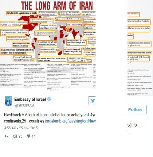 این نشریه مینویسد که حتی توییت سفارت اسرائیل در واشینگتن نیز به نسبت اظهارات ترامپ ملایمتر بوده چرا که در این توییت از «فعالیتهای ترویستی» ایران در جهان سخن گفته میشود و نه «حملات تروریستی». به یک معنا اگر همه مواردی را که سفارت اسرائیل عنوان کرده است در نظر بگیریم، درمییابیم که تعداد حملاتی که به وقوع پیوسته کمتر از این بوده و تنها پنج مورد را شامل میشود که به کشتار منجر شده و ظن دست داشتن ایران در آن میرود، یعنی حملات بحرین، بلغارستان، هند، گرجستان و تایلند. جز این، شش حمله از مواردی که سفارت اسرائیل به آنها اشاره کرده، خنثی شدهاند. در عین حال که موارد دیگری که اسرائیل به آنها اشاره کرده بیشتر درباره دخالت و نفوذ ایران در کشورها و حکومتهای دیگر بوده است تا حمله تروریستی.