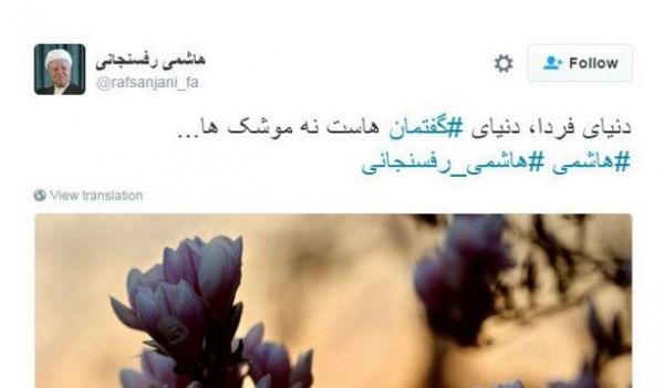 متن این توییت که یک هفته پیش در "حساب رسمی پایگاه اطلاع رسانی آیت الله هاشمی رفسنجانی" منتشر شد، این بود: "دنیای فردا، دنیای #گفتمان هاست نه موشک ها... #هاشمی #هاشمی_رفسنجانی".