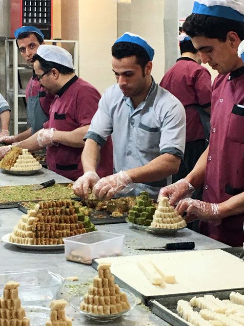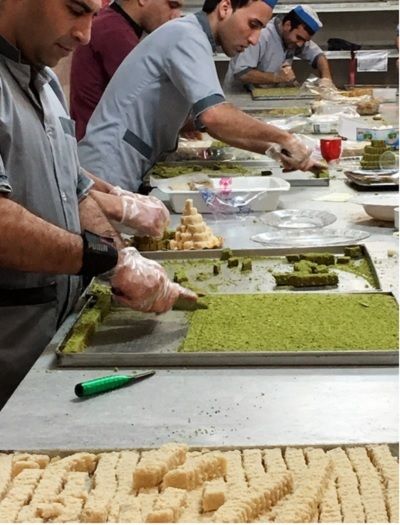 سپس خبرنگار نیویورک تایمز مواد تشکیل دهنده این شیرینی را برای خوانندگان تشریح کرده و نوشت : "آرد نخود، تخم مرغ، شکر، بادام و هل و گلاب از جمله مواد اصلی شیرینی های حاج خلیفه هستند."