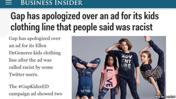 نماینده بخش کودگان شرکت گپ گفت "به هر کسی که (از این موضوع) ناراحت شده است میگوئیم، متاسفیم."شرکت آمریکایی گپ بابت یک آگهی تبلیغاتی لباس کودک که برخی آن را "نژادپرستانه" توصیف کردهاند، معذرت خواهی کرد.