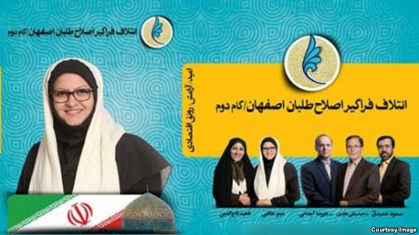 پوستر انتخاباتی خانم خالقی؛ مردی که در میان پنج کاندیدای اصلاح‌طلبان اصفهان قرار دارد، علیرضا آجودانی است که به گفته وزارت کشور با ردصلاحیت خانم خالقی، جایگزین او خواهد شد.محمدرضا یزدان پناه