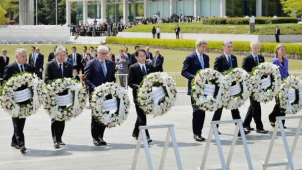 از چپ: وزرای خارجه فرانسه، ایتالیا، آلمان، ژاپن، آمریکا، بریتانیا، کانادا و مسئول سیاست خارجی اتحادیه اروپا در بنای یادبود قربانیان بمباران اتمی هیروشیماوزیر خارجه آمریکا برای اولینبار از بنای یادبود قربانیان بمباران اتمی هیروشیما در ژاپن بازدید کرده است.جان کری بلندپایهترین مقام آمریکایی است که به هیروشیما رفته است. شهری که بر اثر بمباران اتمی آمریکا در سال ۱۹۴۵ حدود ۱۴۰ هزار کشته داد.
