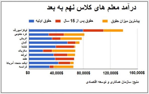 البته میزان درآمد معلم ها در کشور های مختلف متفاوت است، معلم ها در کشور لوکزامبورگ بیشترین در آمد را نسبت به کشور های دیگر دارند. جدول زیر درآمد سالانه معلمان چند کشور را مقایسه کرده است؛