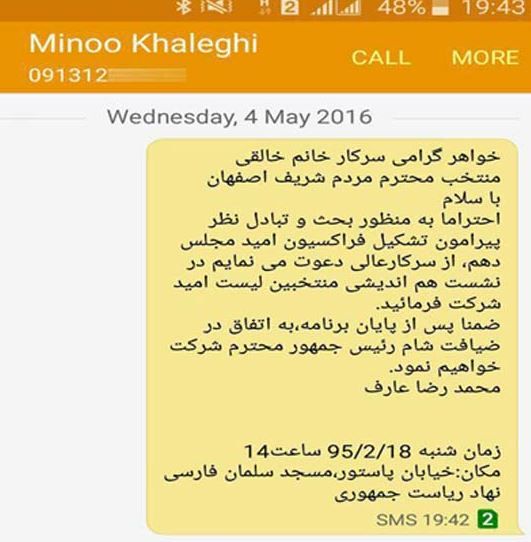 پیامک عارف به «مینو خالقی» برای ضیافت شام روحانی!