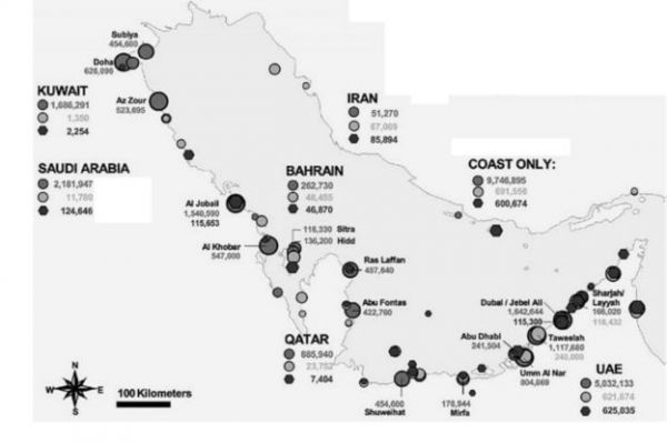 حداقل ۵۵ آبشیرینکن در کشورهای مختلف حاشیه خلیج فارس مشغول فعالیت هستند و امارات متحده عربی، عربستان و کویت بیشترین میزان آب را شیرین میکنند.