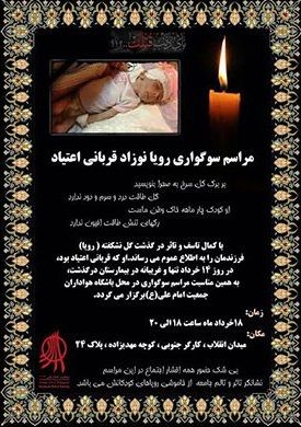 بچههای جمعیت امام علی برای رویا اعلامیه چاپ کردهاند. عکس رویا روی تخت بیمارستان بالای اعلامیه زده شده است؛ نوزادی در یک لباس صورتی با صورتی نحیف و بانداژ شده. آنها در این اعلامیه از مردم خواستهاند که برای فردا ساعت شش تا هشت شب در مراسم سوگواری رویا شرکت کنند و تاثر و تالم جامعه را از خاموشی رویاهای کودکان نشان دهند.