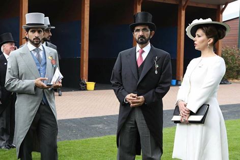 در این تصویر، "محمد بن راشد آل مکتوم"، نخست‌وزیر و معاون رییسِ "امارات متحده عربی" و "امیر" دوبی، در کنار همسرش "هیا بنت حسین" و فرزندش "شیخ حمدان" در محل مسابقات اسب‌دوانی "اپسم" در حومه‌ی جنوبی لندن دیده می‌شود.