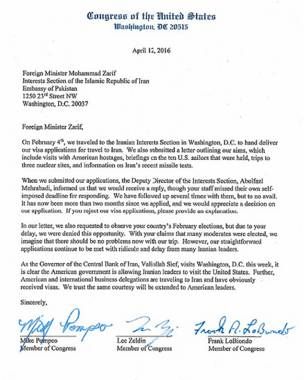 آقای پمپئو، از حزب جمهوریخواه و عضو کمیته اطلاعات مجلس نمایندگان، در فیسبوک خود با اشاره به این نامه گفته است که "نامه بی معنی وزارت خارجه ایران امضا ندارد، با ماه‌ها تاخیر ارسال شده و درخواست ما برای سفر به ایران را 'شگرد تبلیغاتی' خوانده است." وی افزوده که محتوای نامه، پاسخ به درخواست دریافت ویزا نیست بلکه "تلاشی برای پنهان کردن بعضی از 'شگردهای تبلیغاتی' نمایشی‌تر آیت الله مثل نوشتن شعار اسرائیل باید محو شود بر موشک‌های بالستیک، طرحریزی برای انفجار در واشنگتن و ربودن ملوانان آمریکایی در روز سخنرانی سالانه رئیس جمهوری است."