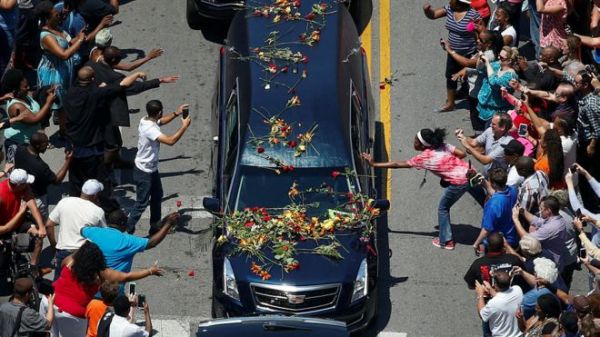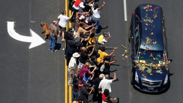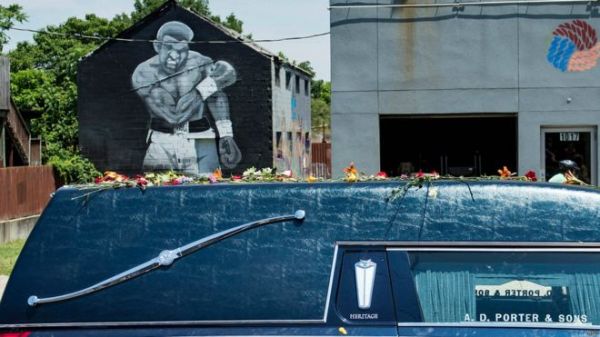 خودروی حامل تابوت محمدعلی از مقابل اماکن مهم در زندگی او در حالی عبور کرد که جمعیت سوگوار با فریاد علی، علی به یکی بزرگترین چهره‌های قرن بیستم ادای احترام کردند.