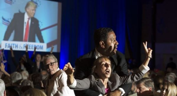 هنگامی که آقای ترامپ در حال انتقاد از هیلاری کلینتون، نامزد احتمالی دمکرات‌ها در انتخابات ماه نوامبر، بود و در سکوت منتظر تشویق مهمانان بود تعدادی معترض با بالا گرفتن انگشتان خود به نشانه «پیروزی» شعار دادند، «آمریکا! آمریکا!»