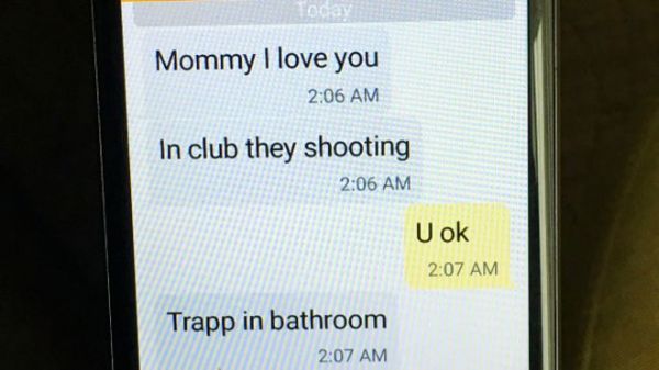 یک دقیقه بعد پسرش جواب داد "در دستشویی گیر افتادهام" و بعد نوشت که در باشگاه پالس است و از مادرش خواست پلیس خبر کند.