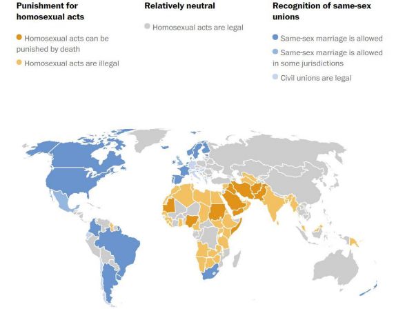 این نقشه که روز سهشنبه (۱۴ ژوئن-۲۵ خرداد) در وبسایت روزنامهی امریکایی واشنگتنپست منتشر شده، آخرین وضعیت حقوق همجنسگرایان را در نقاط مختلف جهان نشان میدهد.بر اساس این نقشه، در ۱۲ کشور که با رنگ نارجی مشخص شدهاند، همجنسگرایی میتواند با مجازات مرگ منجر شود. در قوانین برخی از این کشورها مانند عراق، نیجریه، و سومالی، مجازات مرگ برای همجنسگرایی در نظر گرفته نشده است اما در برخی مناطق آنها که تحت کنترل گروههای شبهنظامی و دادگاههای اسلامی است، این مجازات به اجرا در میآید.