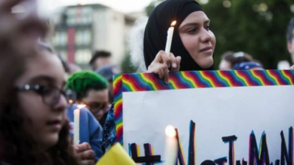 Image caption گروهی از مسلمانان در تجمعی به نشانه محکوم کردن کشتار اورلاندو پلاکاردی با شعار به نام من، نه! را همراه داشتند
