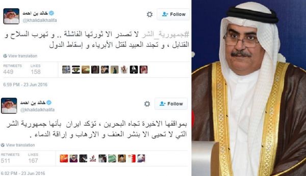 تقاطع : وزیر امور خارجه بحرین میگوید مواضع اخیر جمهوری اسلامی ایران دربارهی مسائل این کشور تایید میکند که «"جمهوری شر" حیاتش به گسترش خشونت و ترور و خونریزی وابسته است»."خالد بن احمد" ساعاتی قبل در عصر پنجشنبه (۲۳ ژوئن-۳ تیر) در صفحهی توییتر خود نوشت: «جمهوری شر چیزی صادر نمیکند به جز انقلاب شکستخوردهاش؛ اسلحه و بمب قاچاق میکند، و برای کشتن بیگناهان و ساقط کردن حکومتها برده استخدام مینماید.»