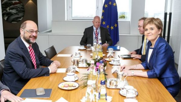 در سفر به بروکسل، خانم استورجن پس از ملاقات با مارتین شولتز، رئیس پارلمان اروپا، گفت که "اسکاتلند مصمم است عضو اتحادیه اروپا باقی بماند." آقای شولتز نیز گفت که در این دیدار "گوش دادم و آموختم."