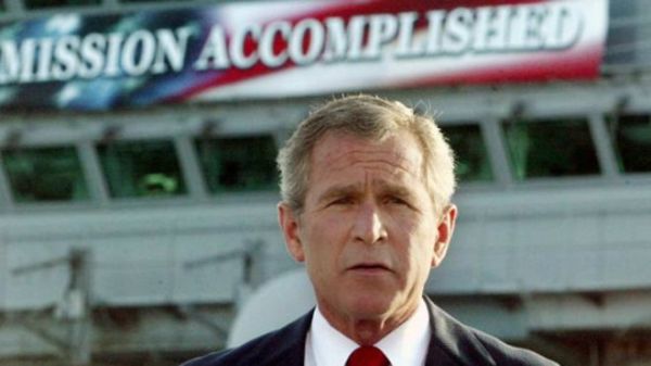 جورج بوش هنگام اعلام پایان موفقیت‌آمیز عملیات نظامی و سقوط حکومت عراق - شعار پشت سر او: ماموریت انجام شد جورج بوش، رئیس جمهوری سابق آمریکا، از حمله نظامی به عراق برای برکناری صدام حسین، رهبر سابق آن کشور دفاع کرده است و مقامات دولت کنونی ایالات متحده نسبت به گزارش اخیر در باره جنگ عراق واکنش نشان داده‌اند.