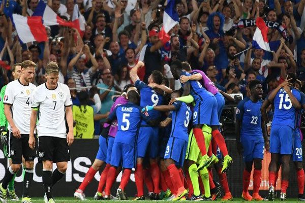تیم ملی فوتبال فرانسه در دومین بازی مرحله نیمه نهایی رقابتهای یورو ۲۰۱۶ جدال حساسی برابر آلمان برگزار کرد و روی درخشش آنتون گریزمان، قهرمان جام جهانی را شکست داد تا حریف پرتغال در فینال شود. تیم های ملی فوتبال فرانسه و آلمان از ساعت ۲۳:۳۰ روز پنجشنبه دومین بازی مرحله نیمه نهایی رقابتهای یورو ۲۰۱۶ را برگزار کردند که طی آن تیم فرانسه با حساب ۲ بر صفر حریف قدرتمند خود را شکست داد تا فینالیست شود. آنتون گریزمان زننده هر دو گل خروس ها در این مسابقه مهیج بود.فرانسه با فشار فراوان تماشاگرانش بازی را تهاجمی شروع کرد. در دقیقه ۶ بازی بود که آنتون گریزمان درون محوطه جریمه آلمان صاحب توپ شد و ضربه دقیق زمینی خود را به تیر مخالف زد که نویر با شیرجه ای بلند مانع گلزنی میزبان شد. برخلاف انتظار حملات خروس ها کوتاه مدت بود و پس از آن ژرمن ها تا اواخر نیمه نخست، بازی را کاملا تحت کنترل خود در آوردند.