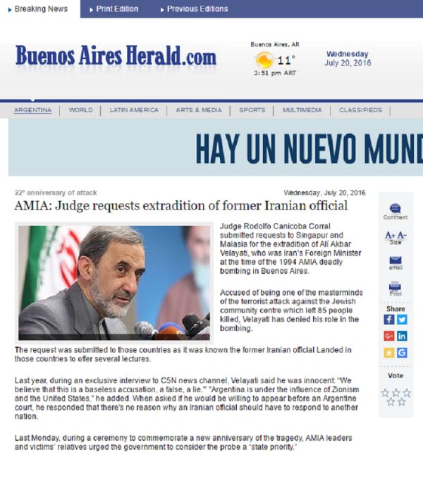 گفتنی است در جریان انفجار مرکز همیاری یهودیان در بوینوس‌آیرس در ۱۸ جولای ۱۹۹۴، ۸۵ نفر از شهروندان یهودی‌تبار آرژانتینی جان خود را از دست دادند و بیش از سیصد نفر زخمی شدند.