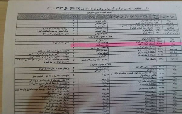 هم‌چنین در سندی دیگر، احمد رضی، سرپرست وقت دانشگاه گیلان که اینک ریاست این دانشگاه را رسماً به‌ عهده دارد در تاریخ ۱۴ دی ۹۲ در نامه‌ای به "خدایی"، رییس "سازمان سنجش" از وی خواسته تا دستور دهد که «با توجه به تکمیل بودن ظرفیت و سقف تعداد دانشجوی راهنمایی‌شده توسط اعضای هیأت علمی این گروه آموزشی»، برای کدرشته ۹۶۲۶ در تکمیل ظرفیت پذیرش دانشجوی دکتری برای نیم‌سال دوم سال تحصیل ۹۳‌-۹۲ «هیچ تعداد دانشجویی پذیرفته و اعلام نشود».