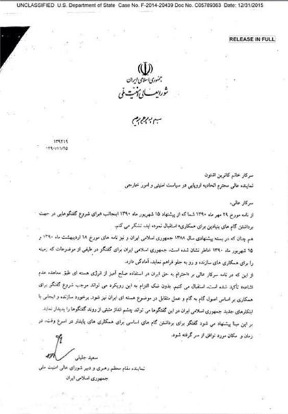 دبیر وقت شورای امنیت ملی ایران مینویسد: «از نامه مورخ 29 مهرماه 1390 شما که از پیشنهاد 15 شهریور ماه سال 1390 اینجانب برای شروع گفتوگوهایی در جهت برداشتن گامهای بنیادین برای همکاری استقبال نمودهاید، تشکر میکنم.»