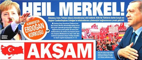 درپی بحران در روابط آلمان و ترکیه، روزنامه آکشام چاپ ترکیه در صفحه اصلی خود تصویری از آنگلا مرکل صدر اعظم آلمان با سبیل هیتلر در حال سلام دادن به سبک نازیها منتشر کرد.به گزارش پایگاه خبری شبکه العالم، روزنامه اشپیگل آلمان در گزارشی این اقدام روزنامه آکشام ترکیه را که طرفدار دولت این کشور می باشد، نوعی پاسخ به جلوگیری از پخش سخنرانی ویدیویی رجب طیب اردوغان رئیس جمهور ترکیه در جمع حامیانش در شهر کلن دانست.
