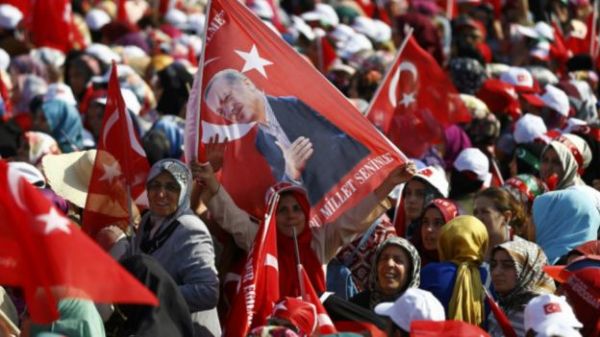 خبرنگار بخش فارسی بی بی سی می افزاید تظاهرات امروز قرار بود "همایش اتحاد" باشد، اما بیش از هر چیز تصاویر رجب طیب اردوغان در دست تجمع کنندگان دیده می شود. عده ای از کودکان و زنان سربندهایی با شعار "اردوغان دوستت داریم" بسته اند و همراه با سر دادن شعارهای مذهبی، می گفتند که حاضرند جان خود را در راه اردوغان فدا کنند.