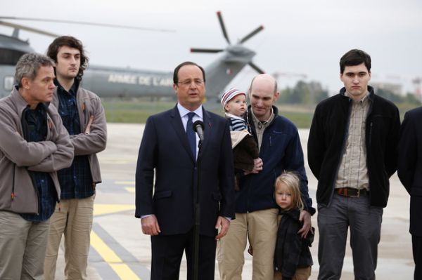 تصویری از روزنامه‌نگاران فرانسوی پس از آزادی، کنار رئیس‌جمهور و وزیر خارجه فرانسه آقای انن برای یک مجله فرانسوی کار می‌کرد، آقای تورس برای یک شبکه تلویزیونی فرانسوی-آلمانی. آقای الیاس عکاس بود و آقای فرانسوا از خبرنگاران باسابقه جنگ. هر چهار نفر سال ۲۰۱۴ آزاد شدند.