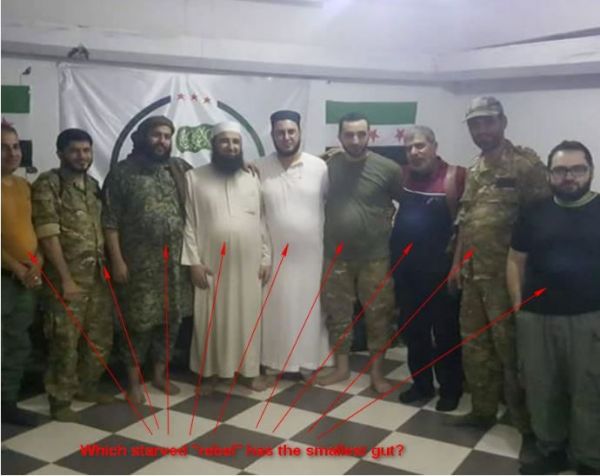انتشار تصویر سرکردگان شکم پرست گروه های تروریستی فعال در سوریه، جنجال بسیاری رادرشبکه های اجتماعی به راه انداخته است.به گزارش شبکه العالم، انتشار این عکس، که در آن شکم های بزرگ سرکردگان گروه های تروریستی فعال در شهر حلب و حومه آن کاملا مشخص است، با موجی از واکنشهای منفی در شبکه های اجتماعی همراه شد.