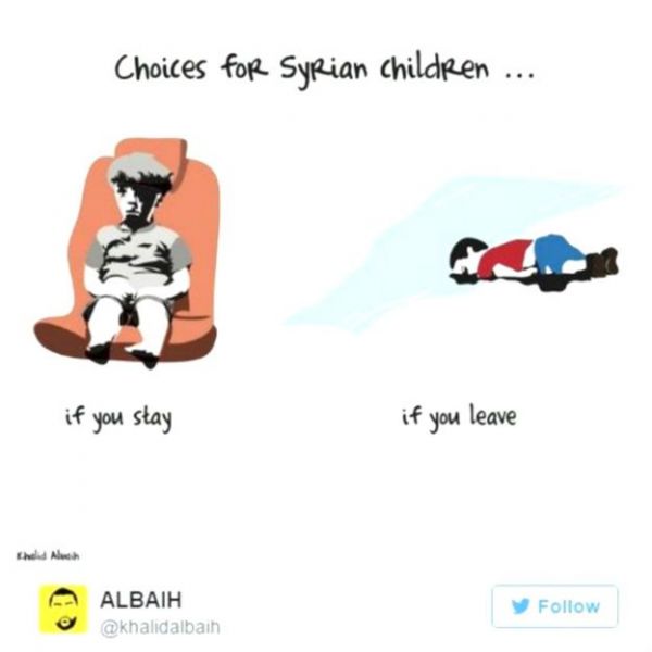 یک کاربر توییتر به نام خالد با انتشار این کارتون نوشته: "وضعیت کودکان در سوریه چنین است؛ بروند (آیلان)، بمانند (عمران). آن طور که مرکز رسانه حلب که نهادی حامی مخالفان دولت است گزارش کرده، خوشبختانه عمران، والدین و سه خواهر و برادرش از بمباران جان سالم به در بردهاند هر چند تصویر مغموم و وحشتزده عمران خیلی زود به نمادی از "زندگی جهنمی ساکنان حلب" تبدیل شده است.بیشتر بخوانید: