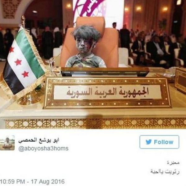 کاربر دیگری به نام ابو یوشع در توییتر، با مونتاژ عکس عمران بر روی صندلی خالی سوریه در اتحادیه عرب، بحران سوریه را به تصویر کشیده است بالا گرفتن درگیریها باعث شده ارسال کمکهای بشردوستانه برای سکنه مناطق محاصره شده، از ابتدای ماه جاری (اوت) متوقف شود.صدها هزار سوری غیرنظامی هنوز در مناطقی زندگی می کنند که یا از سوی ارتش سوریه محاصره شده و یا در کنترل و محاصره شبه نظامیان مخالف دولت است.
