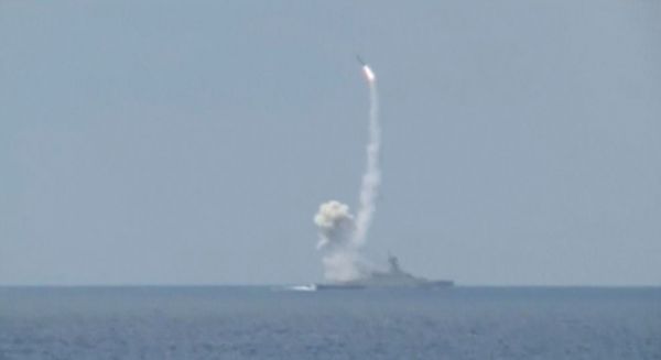 تصویر منتشر شده توسط وزارت دفاع روسیه از شلیک موشکهای کروز از کشتیهای روسیه در مدیترانه کشتیهای روسی مستقر در شرق مدیترانه، روز جمعه در اقدامی که «بخشی از عملیات مشترک نیروی دریایی و نیروی هوافضای روسیه» توصیف شده، با استفاده از موشکهای کروز مواضعی را در سوریه هدف قرار دادند.روز جمعه ۲۹ مرداد، خبرگزاری آسوشیتدپرس به نقل از وزارت دفاع روسیه نوشت که دو کشتی روسیه مستقر در شرق مدیترانه سه موشک کروز دوربرد، موسوم به کالیبر، را به سمت مواضع «شعبهای از القاعده در سوریه» که پیشتر با نام جبهه النصره فعال بود، شلیک کردهاند.