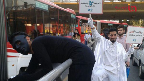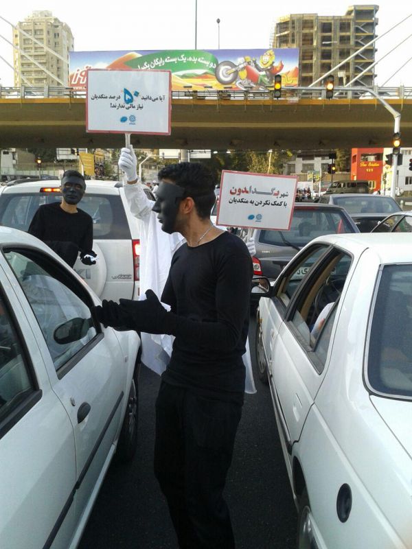 نه خیر، اشتباه فکر کردهاید. اینها متکدی نیستند بلکه در حال اجرای طرحی هستند که به دنبال فرهنگسازی برای مقابله با تکدیگری است؛ طرحی که سازمان رفاه و مشارکتهای اجتماعی شهرداری تهران پیادهسازی کرده است. البته جوان سومی هم با لباسی سفید و تابلوهایی در دست که آرم شهرداری تهران بر خود دارند، پیامهایی را برای مقابله با گدایی به مردم می رساند.